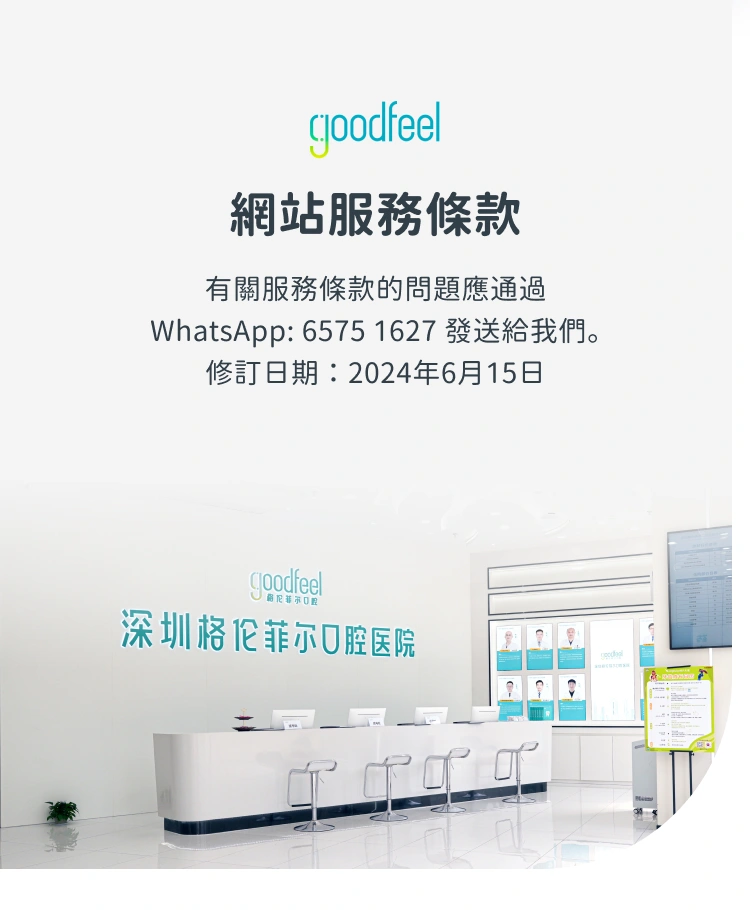 本網站由goodfeel牙科明確擁有及經營。除非另有說明,否則本網站上的設計及內容功能,包括資訊及其他材料、插圖、產品佈局及設計、圖示、導航按鈕、圖像、藝術作品、平面設計、攝影、文字、數據、音訊、軟體等,以及其選擇、組合及鋪排(以下簡稱「網站資訊」),均由goodfeel牙科或其附屬公司擁有,或由協力廠商服務供應商授權予goodfeel牙科。本網站整體及部分均受版權、商標權、服務標識權、商號權,以及其他知識產權和其他所有權權利保護,並保留所有其他適用權利。
